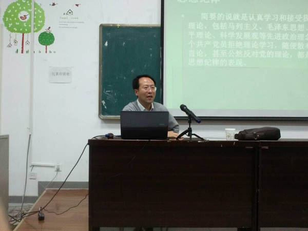 马拥军老师首先强调了共产党员一定要严于律己,并且以最近发生在我们身边的实例入手,讲述了作为一名党员,应该时刻注意我们的言行举止、生活作风。作为一名大学生要有一定的担当意识。马老师重点从党的纪律入手,详细地讲解了党的思想纪律、党的组织纪律、党的政治纪律以及党的作风纪律。各位学生党员通过马拥军老师对党的纪律的全面讲解,意识到了作为一名党员必须具有的基本素质,认识到一名共产党员一定要严于律己,要从组织上、政治上、思想上、作风上真正入党,成为一名合格的共产党员。
