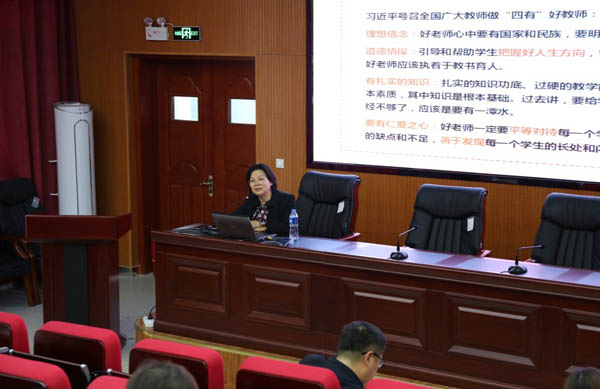 张教授从古今中外对师德师风基本内涵的理解认识,结合对习近平总书记2018年5月2日在北京大学的重要讲话和2018年9月10日在全国教育大会上的重要讲话精神的学习领会,重点阐述了坚持立德树人、强化教师队伍建设的重要性。她详细解读了《教育部关于建立健全高校师德建设长效机制的意见》和《新时代高校教师职业行为十项准则》等师德师风建设相关文件精神,同时对教育部《十项准则》与《金沙js3777入口检测师德失范行为处理办法(试行)》进行了对照说明。生动的讲座使与会教职工加深了对师德师风建设重要意义、重点工作的理解,进一步牢记肩负的历史使命和职责,进一步明确师德师风和教师职业道德的底线、红线、高压线。对全面贯彻全国高校思想政治工作会议精神,全面加强学院师德师风建设工作都具有十分重要的指导意义。