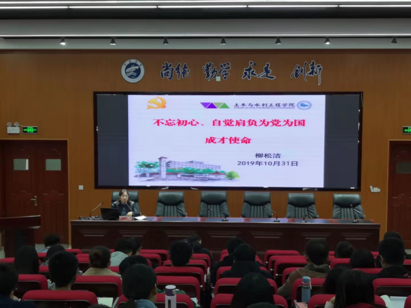 2019年10月31日晚,土木与水利工程学院党委副书记柳松洁在知行楼三阶报告厅为学院学生党员做“不忘初心,自觉肩负为党为国成才使命”的专题党课。