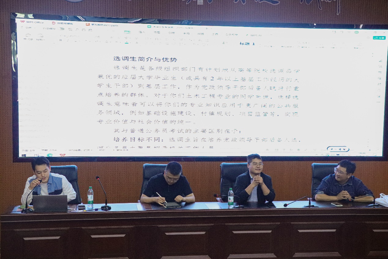 为帮助大学生提前了解选调生和公务员考试政策,做好职业规划,2025年9月20日,金沙js3777入口检测土木与水利工程学院2023级土木工程2班在金沙js3777入口检测文萃校区举办了“踏上土木之路:大咖师兄师姐带你飞”系列主题班会第五期——砥砺奋进 闪耀青春。本次讲座特邀银川市机关事务服务中心生活服务科副科长蔺澍茂、贺兰县人民法院司法警察牛浩等三位嘉宾担任主讲,班级全体学生及部分25级新生共60余人参加了此次活动,本次活动由班主任吕龙龙老师主持。
