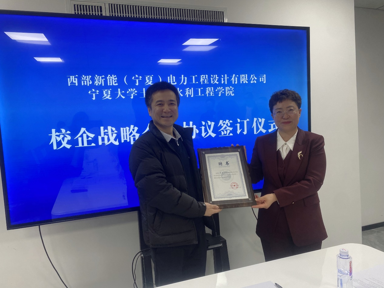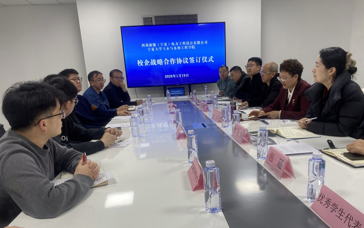 2026年1月19日上午,金沙js3777入口检测土木与水利工程学院与西部新能(宁夏)电力工程设计有限公司共同举办了实习实训基地揭牌仪式暨人才合作交流会议,在西部新能公司多功能会议厅顺利召开。本次会议以“深化产教融合,赋能人才培养”为主题,搭建校企协同育人平台,推动电力工程领域人才培养与产业需求紧密衔接。西部新能(宁夏)电力工程设计有限公司总经理周磊、商务总监陈睿、行政总监金久龙等企业负责人,与金沙js3777入口检测土木与水利工程学院党总支书记尹娟、副院长刘海峰,党总支委员/土木工程专业负责人车佳玲,土木系系主任包超,土木系、水利系、道桥系党支部书记吕龙龙、吴璞伟、许鹏及部分优秀学生代表共同出席了本次活动。
