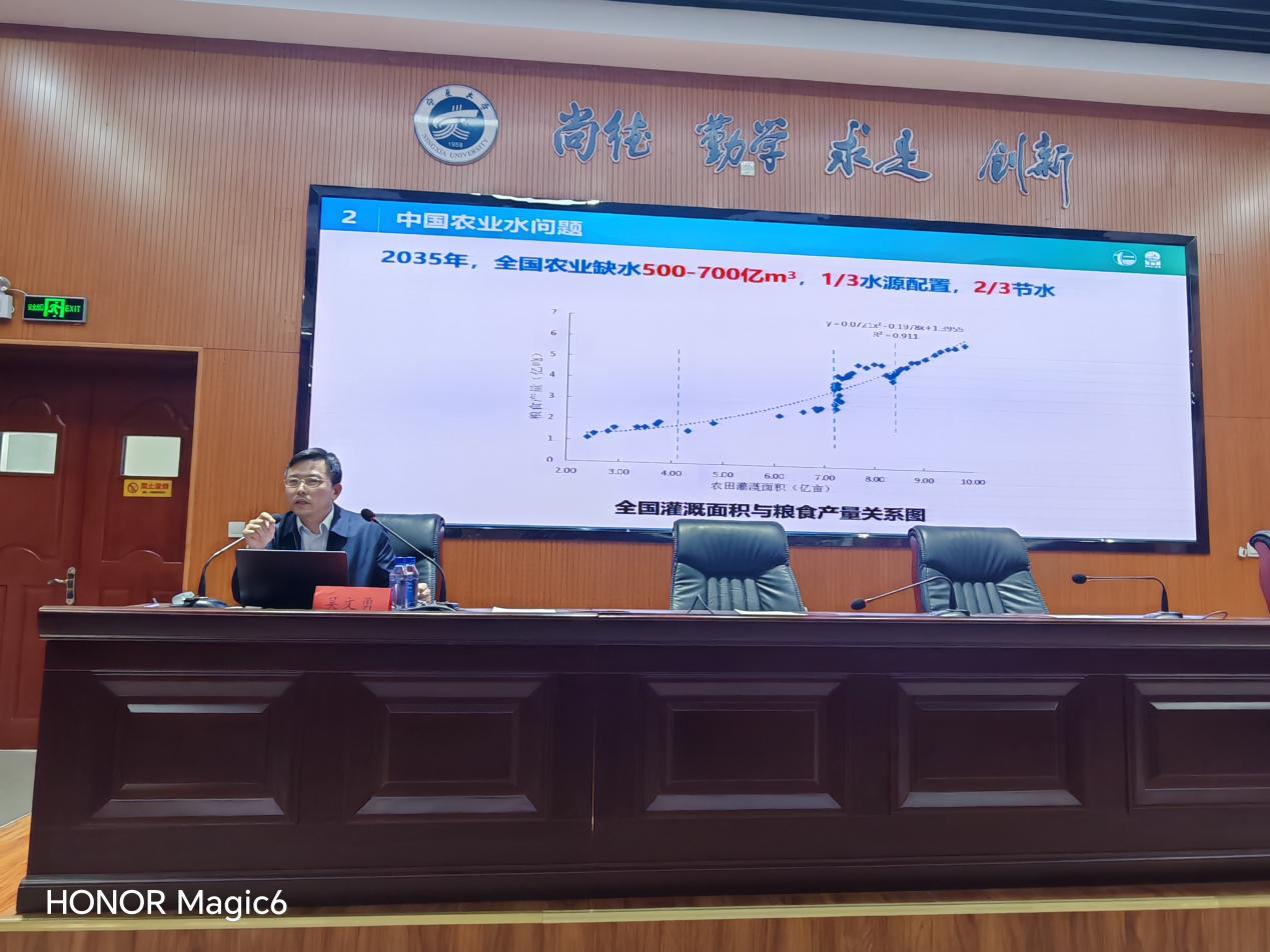 围绕技术实现路径,吴教授重点解析了智慧灌溉四大核心环节:一是基于多光谱遥感与图像识别的作物水分亏缺无损感知,构建区域缺水指数图谱;二是耦合作物模型与气象预报的智能决策体系,生成动态灌溉处方图;三是面向灌区的输配水动态调控,提出以“智慧测控协同”解决复杂水力条件下的精准计量难题;四是水肥一体化时空协同技术,实现营养供给与水分管理的精准匹配。