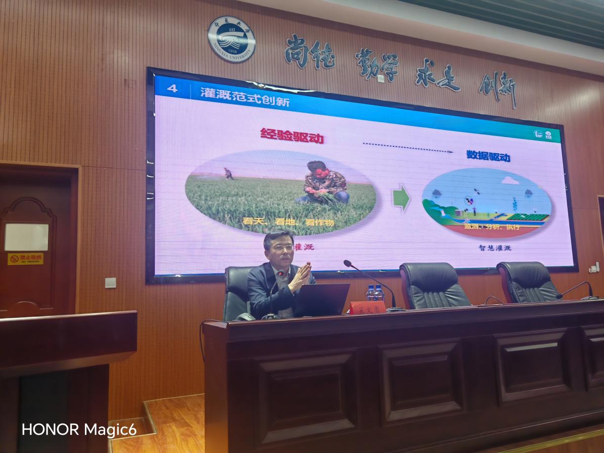 4月15日下午,中国水利水电科学研究院水利研究所副所长吴文勇教授应邀莅临金沙js3777入口检测,在知行楼三阶报告厅为师生带来了一场题为“智慧灌溉发展前沿与技术关键”的学术报告。报告会由学院副院长李王成主持,学院党总支书记尹娟、副书记冯淑萍、副院长刘海峰出席,水利系教师及智慧水利专业百余名本科生到场聆听学习。